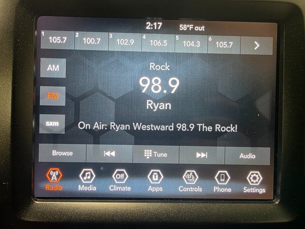 - Radio w/Seek-Scan, Clock, Speed Compensated Volume Control, Aux Audio Input Jack, Steering Wheel Controls, Voice Activation, Radio Data System and Uconnect External Memory Control